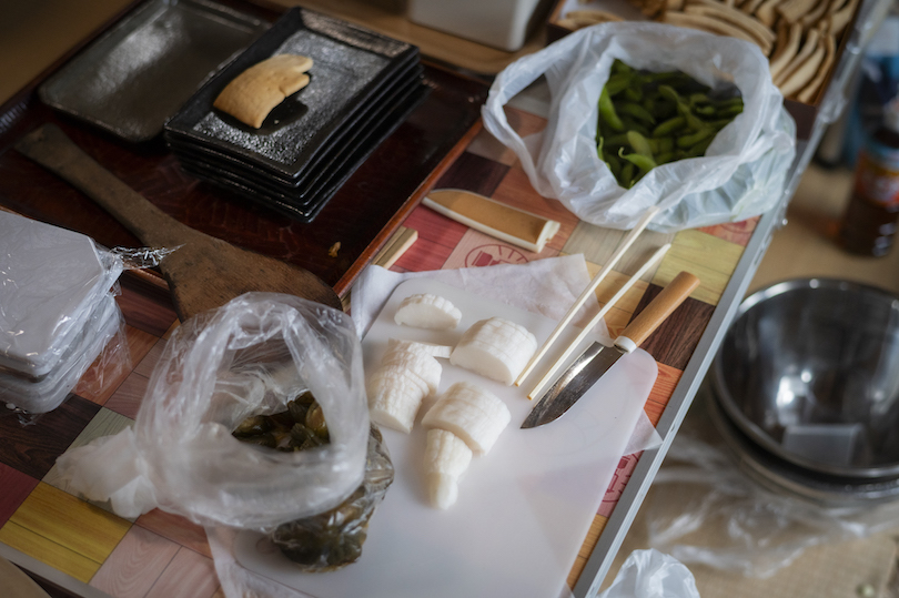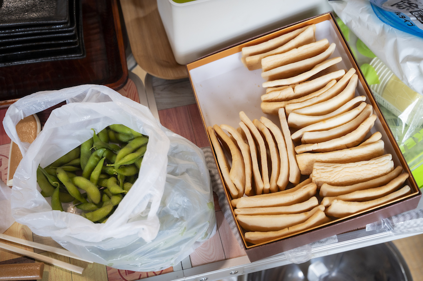 「今年最後の枝豆」と出してくれた大瀧さんの枝豆と阿部さんが栽培したもち米でつくった固餅
