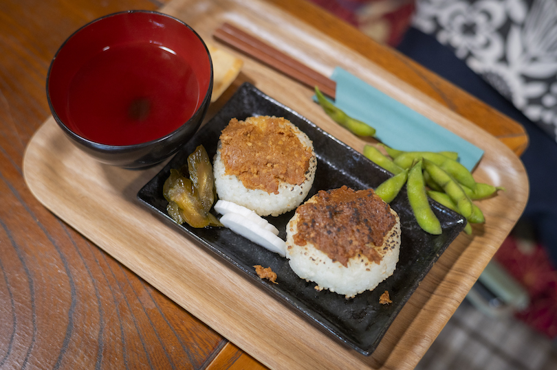 握り飯に生味噌(そのままのお味噌)を全体に塗っていく。たくさん塗るとしょっぱくなるのでほどよい加減(うっすら下のご飯が見える感じ)で塗り、最後に手でやわらかく包んで握りご飯の温度で味噌をなじませていくようなイメージ。握りたて熱々で食べるのが美味しいです