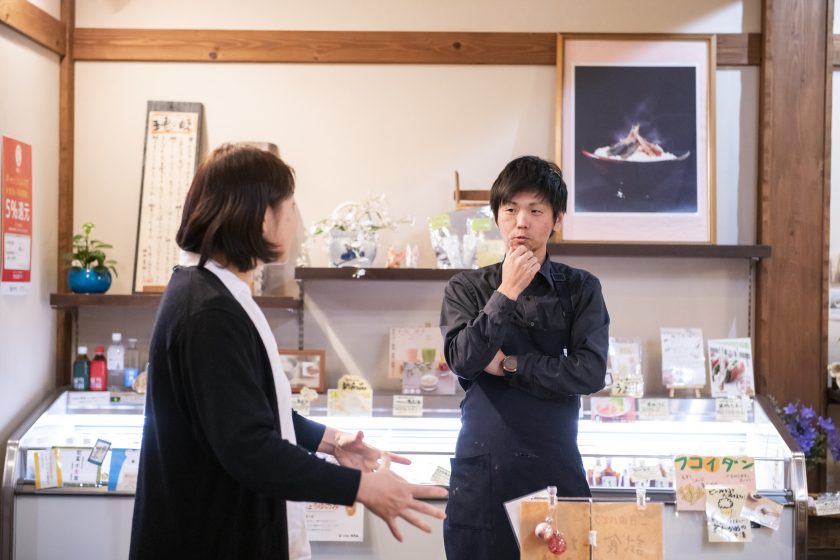 2019年11月某日、弥彦神社の参道沿いにある味噌屋「越後みそ西 弥彦笹屋店」で、とある商品開発の打ち合わせが行われた。メンバーは株式会社越後みそ西の専務取締役でみそソムリエの杤堀佳倫さんと、にしかん岩室エリアのレストラン「灯りの食邸 KOKAJIYA」のオーナーシェフ熊倉誠之助さんの2人。