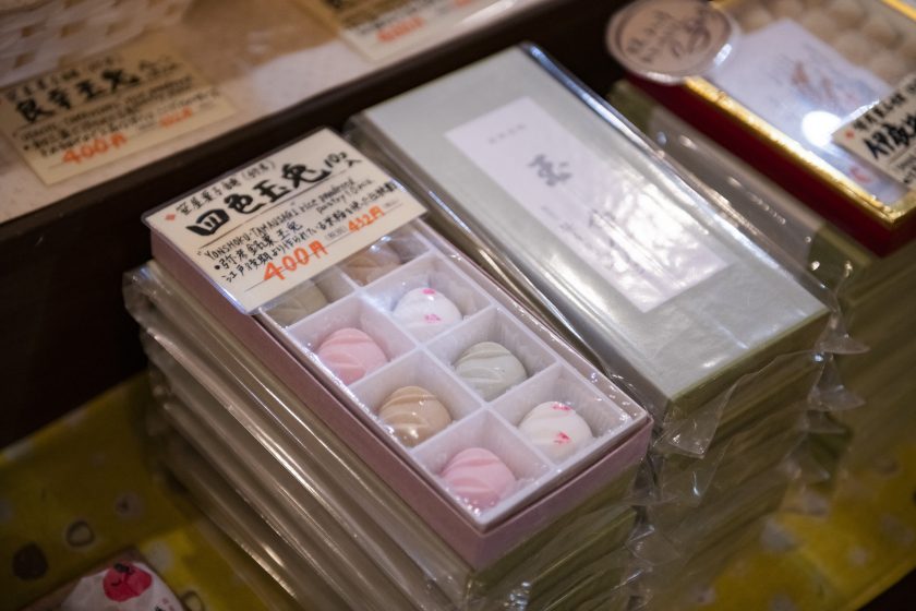 店舗の奥で笹屋菓子舗が製造している弥彦銘菓の玉兎や温泉まんじゅうも店頭に並んでいる
