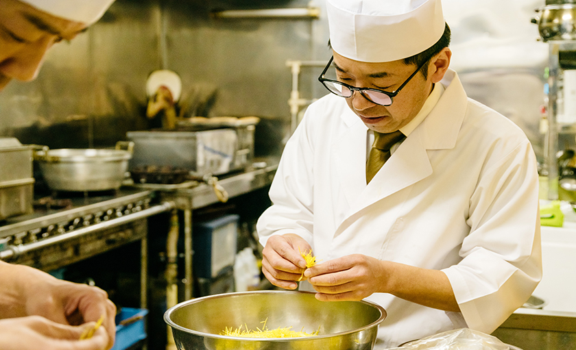 取材時は、西蒲の伝統食材「りゅうのひげ」の仕込みをしていた。鮮やかな黄色をした食用菊で、花びらの一本一本は繊細だが、シャキシャキとした歯ごたえが特徴。向付のツマや、かぶら蒸しのあんの中に入れれば一気に料理が華やかになる。