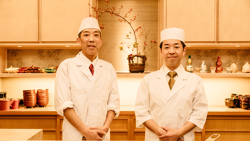 東京の懐石料理の名店「和幸」で共に10年の修行を積んだ、兄・小林信太郎さん(上の写真左)、弟・阿部竜太さん(写真右)の兄弟。生まれ故郷である岩室に「秀石菴」をオープンしたのは、1998年のことだ。 「父の代はここで鮮魚仕出し屋をしていました。修行時代、遠州流茶道家元の懐石料理を担当したことから茶懐石料理を学ばせていただいたのですが、『地元の新潟に戻って、地方の食文化を支えなさい』という教えを修行先からいただき、地元で店を開きました」(信太郎さん)