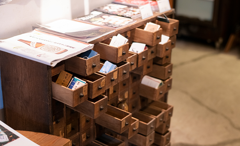 すでに蔵の一角には、近郊のお店のショップカードやイベントのフライヤーを設置