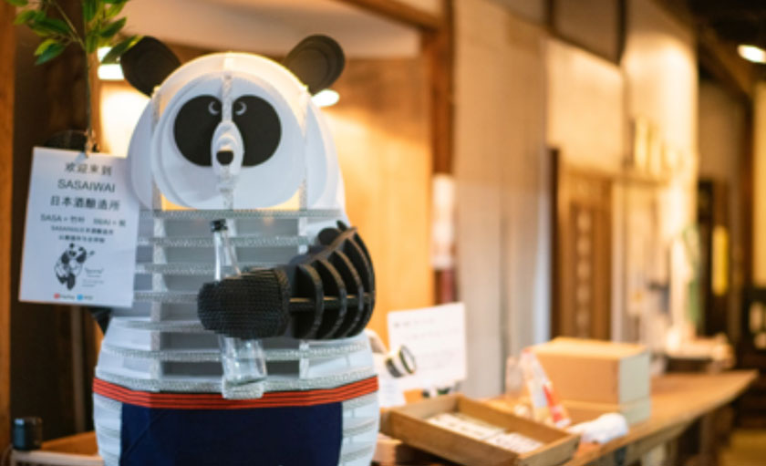 パンダがマスコットキャラクターの笹祝。オブジェの他、Tシャツ、トートバッグ、帆前掛けなどにあしらわれている