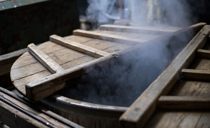 笹口さんが会社に入ってから改革をしたのは、酒のラインナップだけではない。その一つが蔵の整理だ。見学できる蔵にしようと、場所を取っていた古い機械やタンクを処分。それと同時に、酒米を蒸すために導入していた機械制御の蒸米機をあえて廃棄し、昔ながらの和釜と甑(こしき)を使った人力での作業に変更した。